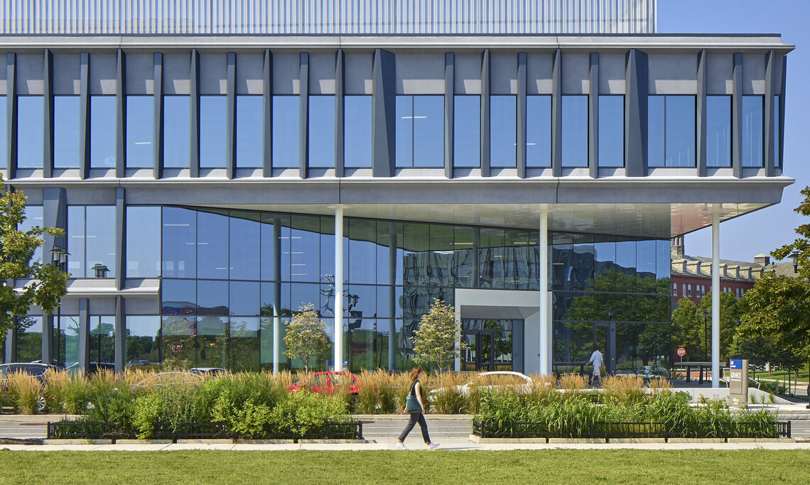 Addressing the primary urban boulevard, a large “front porch” greets visitors while an elevated bridge over functional stormwater gardens creates a biophilic transition to work.